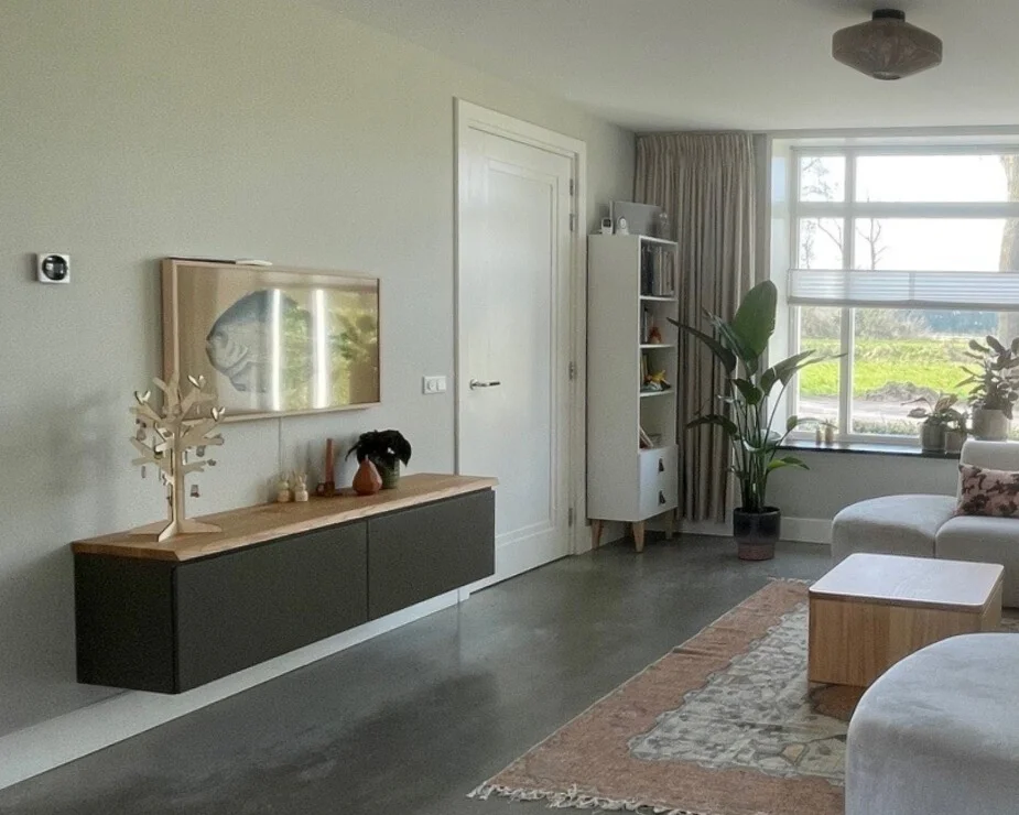 Maatwerk tv-meubel uitgevoerd met een stoer eikenhouten bovenblad en greeploze ladekasten in strak wit lakwerk