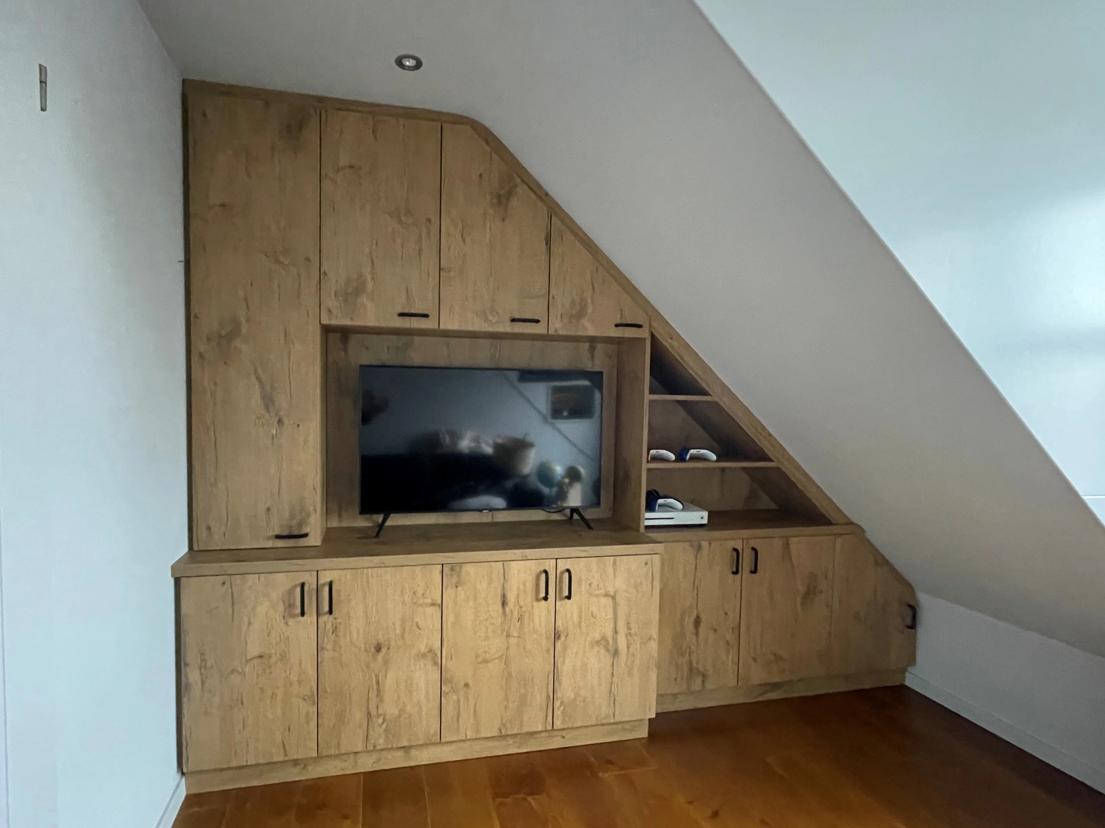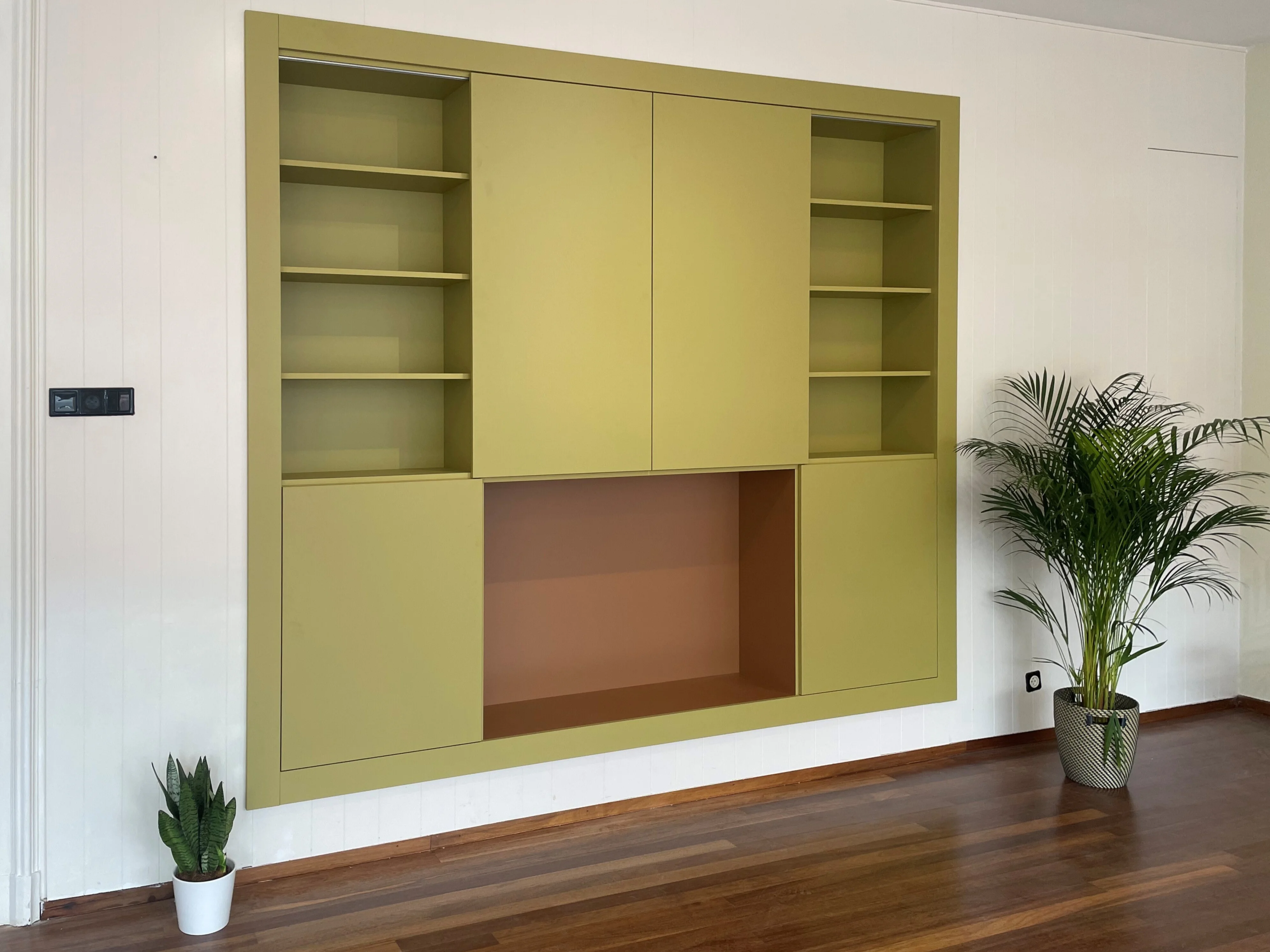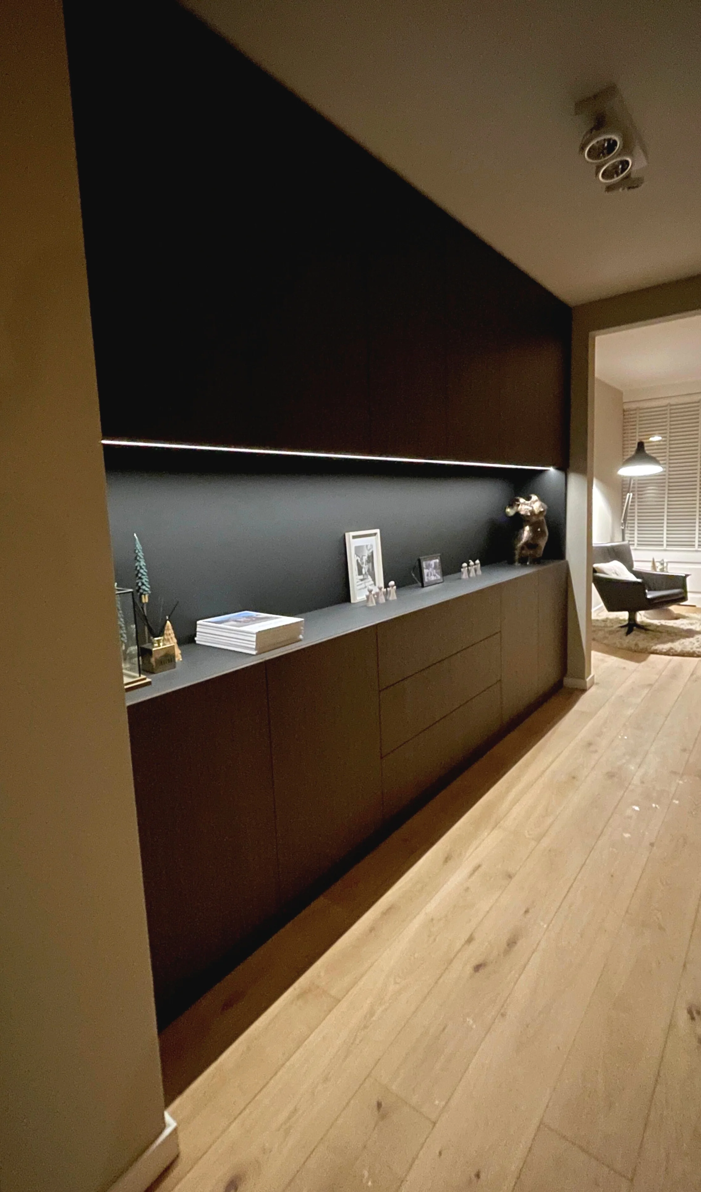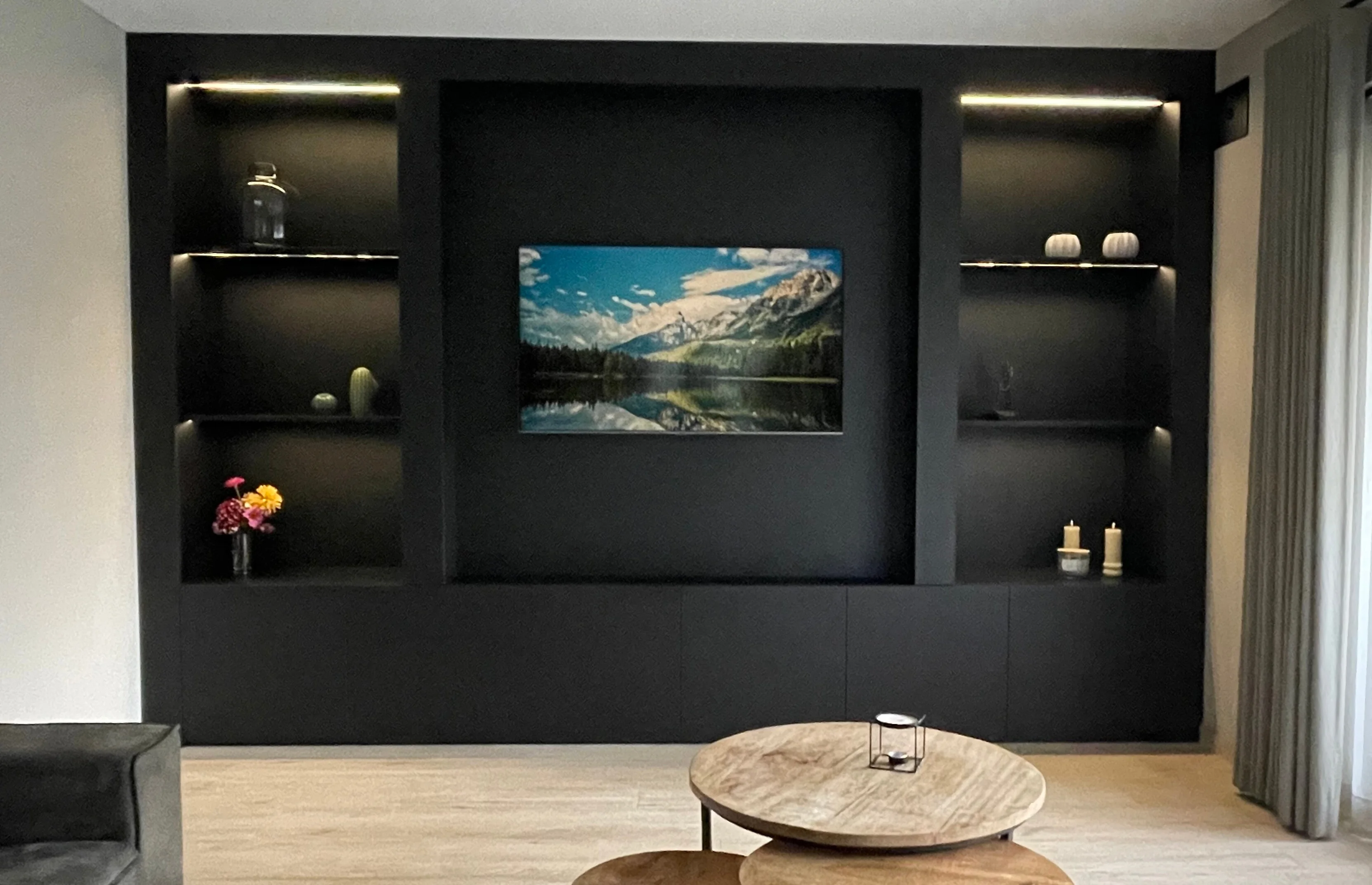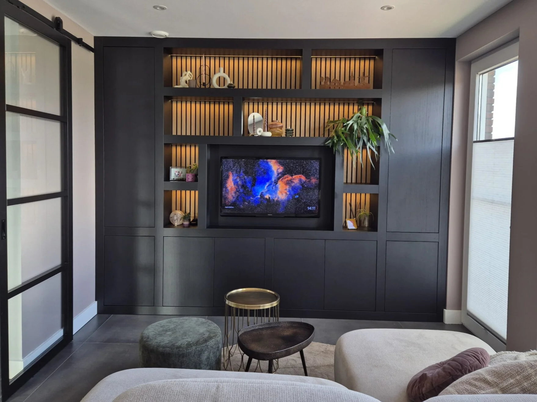 Maatwerk cinewall / kastenwand met veel bergruimte: kasten, lades en open vakken met verlichting