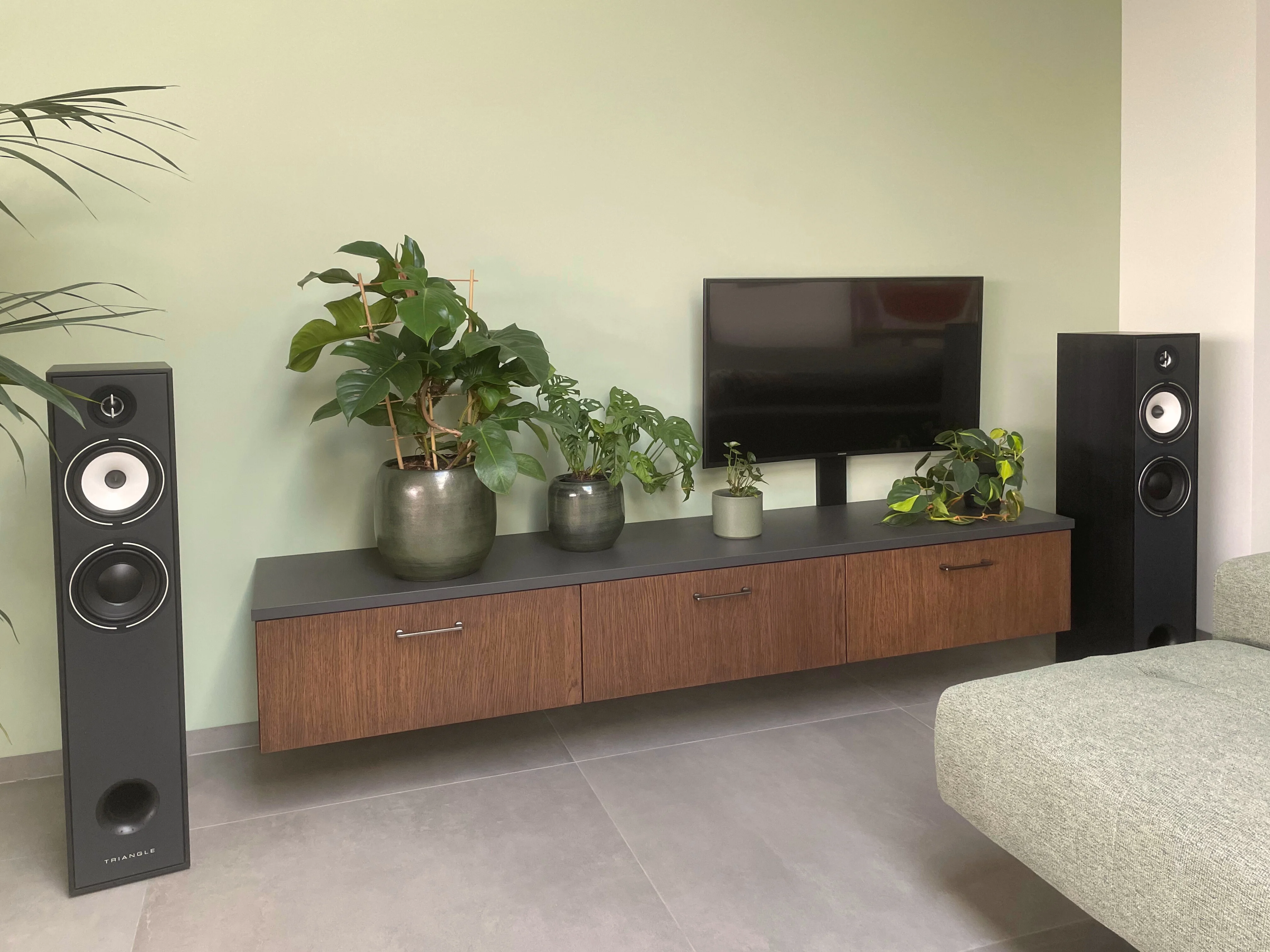 Zwevend tv-meubel in eikenbalkfineer met lakwerk fronten